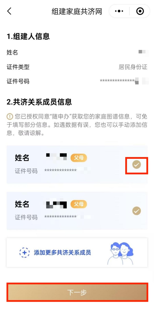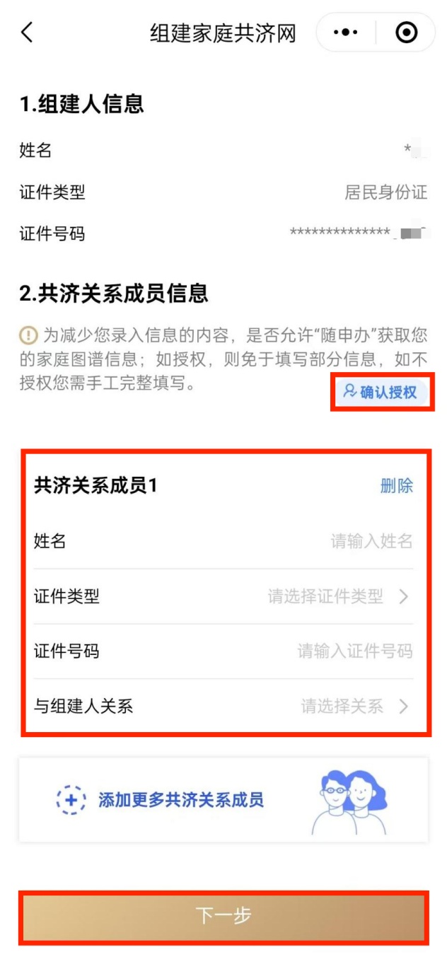 首先,请填写共济关系成员的相关信息,您可一次性添加多名成员。点击“确认授权”按钮,即可迅速获取随申办家庭图谱内成员信息,不在家庭图谱内的成员信息需手动填写完整。信息填写完成后,请点击“下一步”继续进行后续流程。