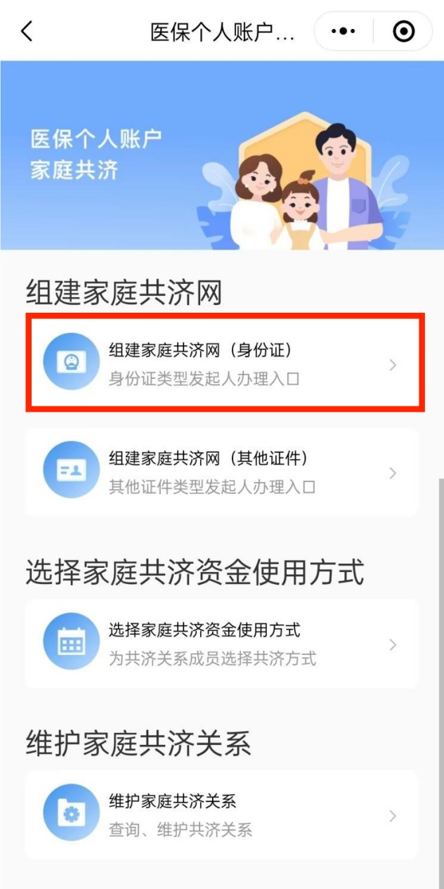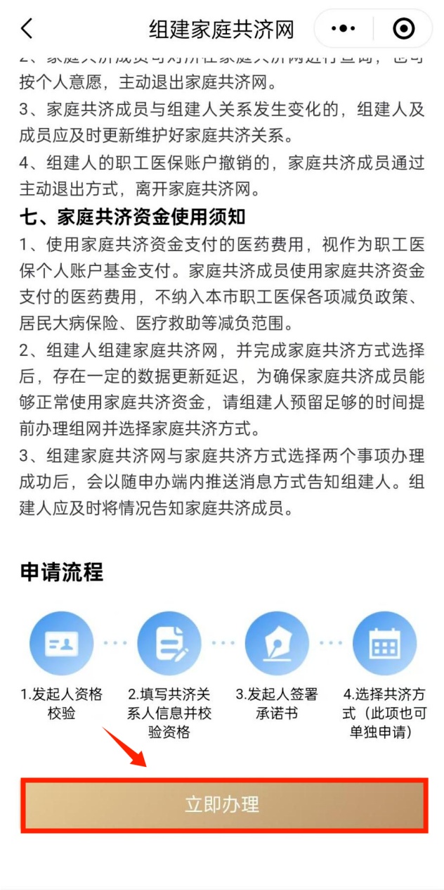 进入职工医保个人账户家庭共济专区,点击下方“立即办理”即可进入申请流程,以“组建家庭共济网(身份证)”为例。