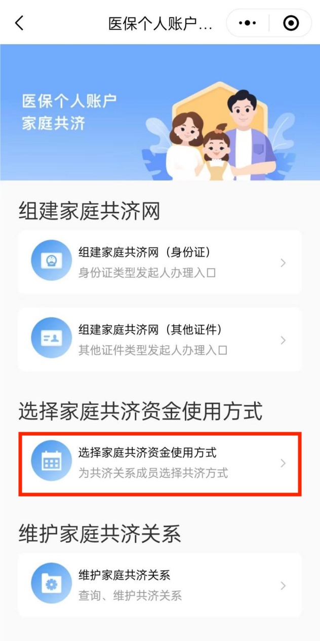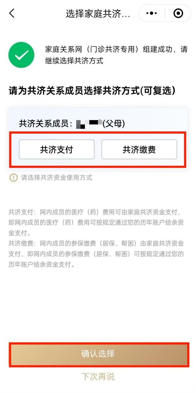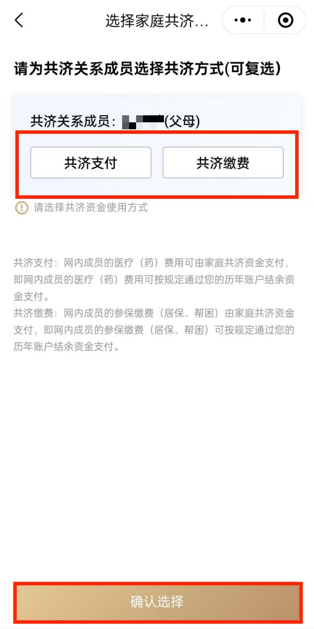 组建人可以进入“选择家庭共济资金使用方式”,在相应成员的条目下取消或选择共济方式,点击“确认选择”便可完成操作。