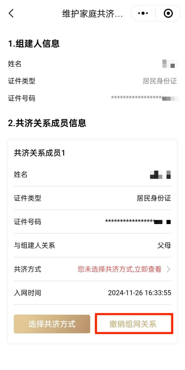 点击进入“维护家庭共济关系”,您将能够查看到当前共济关系成员的信息以及共济方式。点击下方的“撤销组网关系”按钮,即可撤销已组建的家庭共济网。若您日后需要添加已撤销成员,仍然可以在家庭共济专区重新发起组网请求。