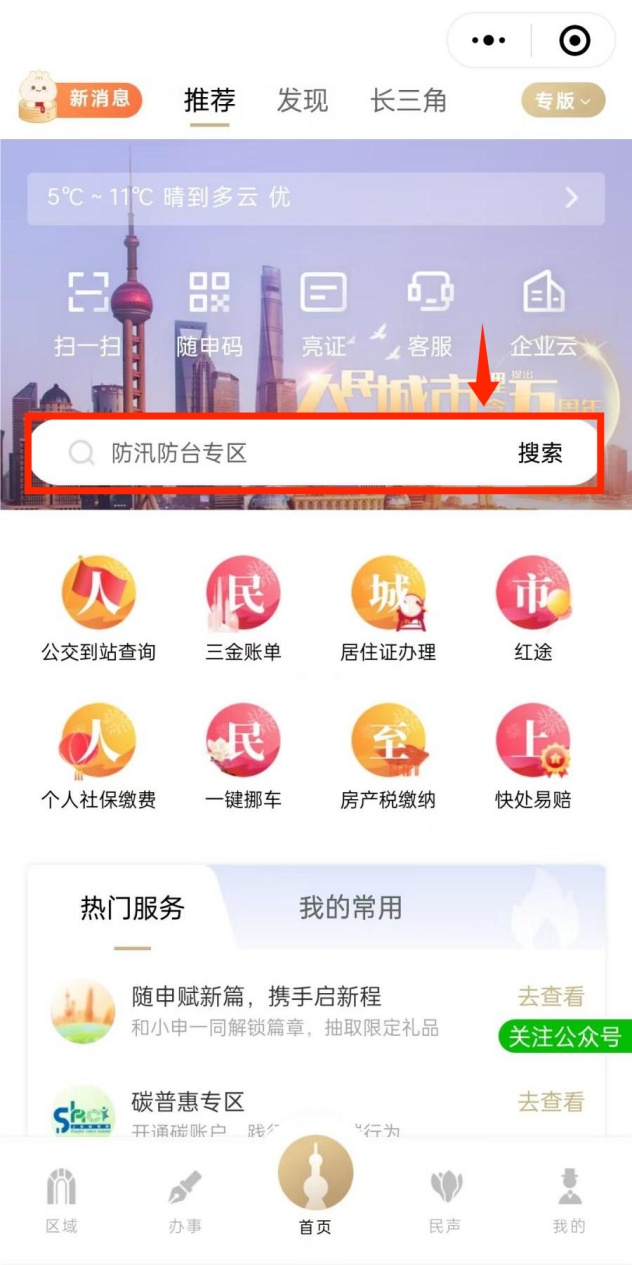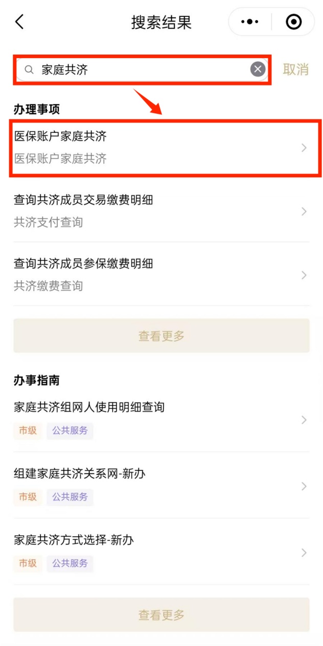 由家庭共济的组建人打开“随申办市民云”(APP、微信小程序、支付宝小程序),在首页搜索栏输入“家庭共济”,点击进入“医保账户家庭共济”专区。