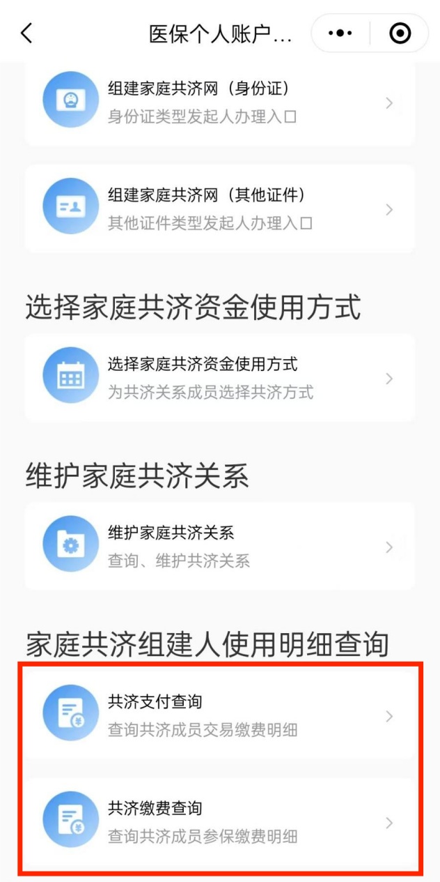 在专区向下滑动,找到“家庭共济组建人使用明细查询”,选择对应资金使用方式的查询入口。温馨提示:您可查询自2022年8月起发生的“共济支付”交易信息,查询的最长时间跨度为两个医保年度。因数据归集存在延迟,“共济支付”当天的数据无法及时查询。