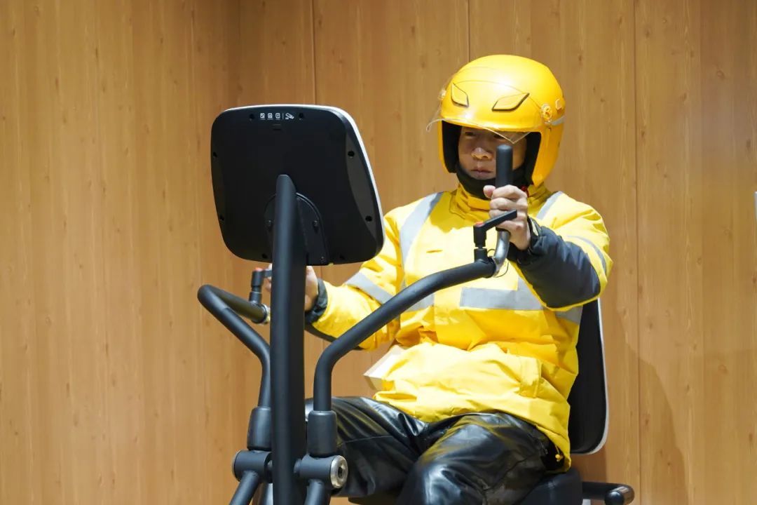在专业人员的指导下,外卖员赵伟在全身有氧健身车上锻炼身体。“这里就在街面上,我平时的单子大部分就在这附近,抽空来这里锻炼很方便”。赵伟说。