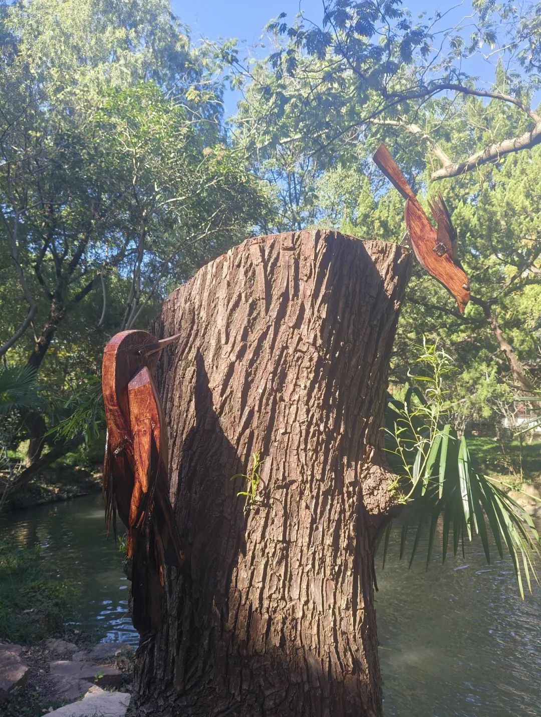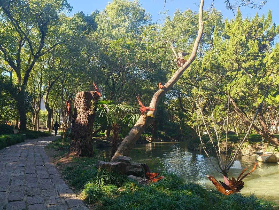 近日,在“十鹿九回头”景点通往香樟林的外湖沿岸,几只“雀鸟”悄然立于枝头,给游客带来耳目一新的视觉体验。据悉,此处造景是醉白池最新打造的木雕景观《林间雀语》。