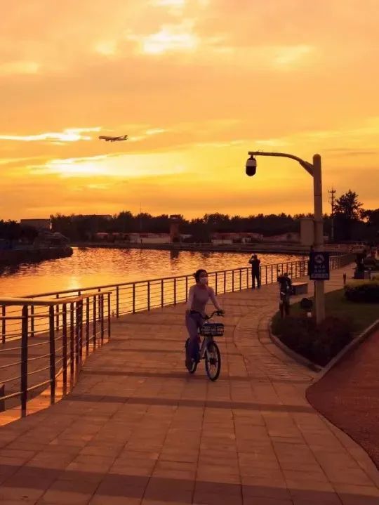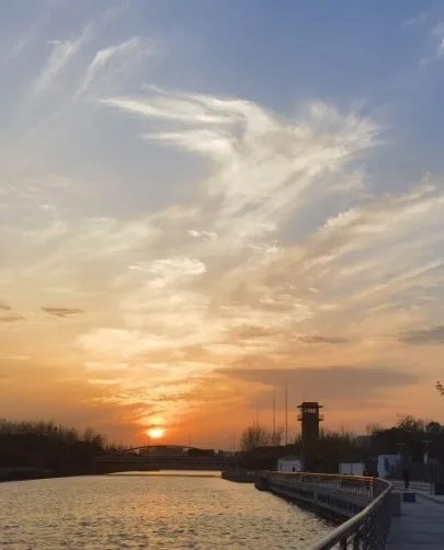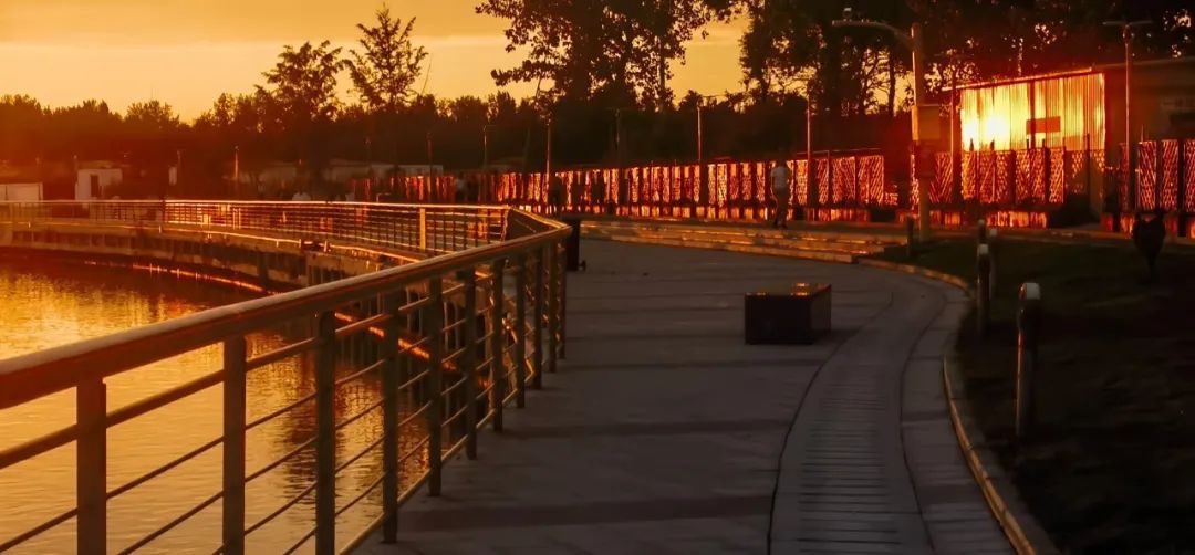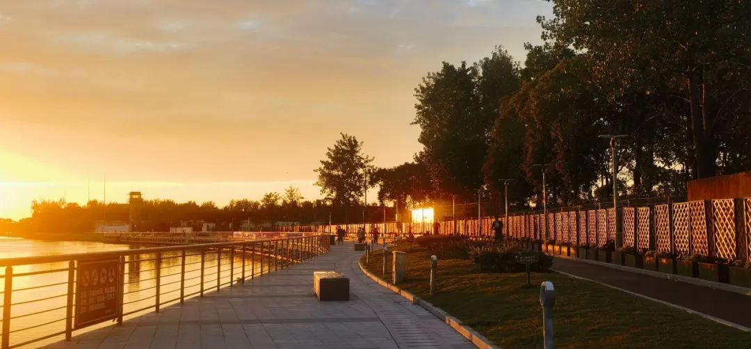 每逢夕阳西下,落日余晖与河堤并行,河面被风吹拂起层层波纹,晚霞的光柔和地铺在河水之上。远处天际点缀着灿烂的云霞,漫步于此,晚风徐徐地送来一阵阵花木夹杂的幽香,使人心旷神怡。