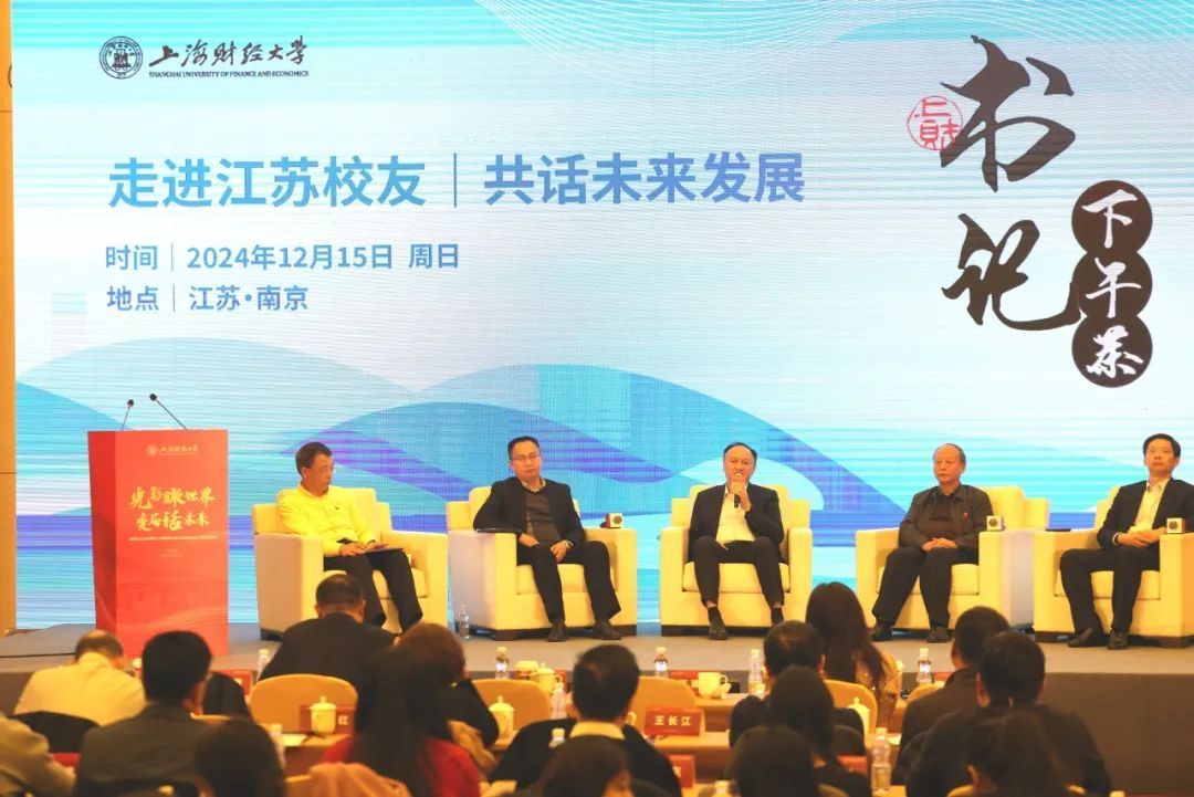 论坛后,还举办了“书记下午茶”活动。上海财经大学党委书记许涛、校董单位南京银行副行长陈谐、南京财经大学副校长叶林祥校友、江苏省财政厅原副厅长江建平校友,围绕党建引领高等教育、校企合作、校校合作等话题进行了交流。活动由南京审计大学副校长裴育校友主持。许涛书记表示,“书记下午茶”是学校党委推出的思政工作品牌,是加强校领导及各级党组织深入基层联系师生、校友,践行“一线规则”的重要载体。希望以本期“书记下午茶”为契机,让校友们充分了解母校的发展情况。面对新的机遇和挑战,上海财经大学紧贴时代脉搏,紧跟时代步伐,实施一系列综合改革,跑出了高质量发展的上财“加速度”。一是聚焦“立德树人”根本任务,根据时代需要调整人才培养方向,努力培养全面发展的新时代财经人才,巩固上财在财经教育领域的领先地位;二是紧密对接国家和区域发展战略,通过打造滴水湖高级金融学院、新建数字经济系、建立中国式现代化研究院等一系列战略布局,推进学校教育事业高质量发展,铸就百年上财新的辉煌。
