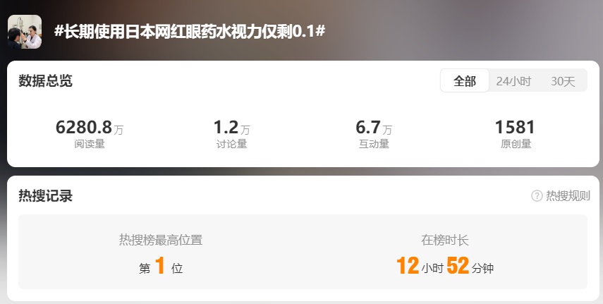 近日,宁波27岁的应女士使用从日本代购的网红眼药水,导致眼睛不适,异物感和充血越来越明显。经过医院检查发现,应女士的视力仅剩0.1。因她长期使用网红眼药水导致药物性角膜上皮损伤,其中的部分化学成分“盐酸四氢唑啉”是罪魁祸首。医生表示,这种成分是肾上腺素类药物,频繁使用可能导致眼部疾病的产生。