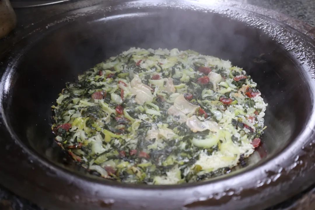 “一碗好吃的菜饭,离不开今年刚收割的新米。新米的稻香味更足,水分更多,是菜饭的灵魂所在。”范明娟一边介绍,一边将洗净的新米倒入锅中翻炒,让每粒米都裹上浓郁的油香。“最后,只需加入适量清水没过表面,盖上锅盖,用灶头的小火慢慢焖煮即可。”大约25分钟后,香气从锅盖的缝隙中弥漫出来,锅底那层金黄酥脆的锅巴,更是菜饭的“点睛之笔”。