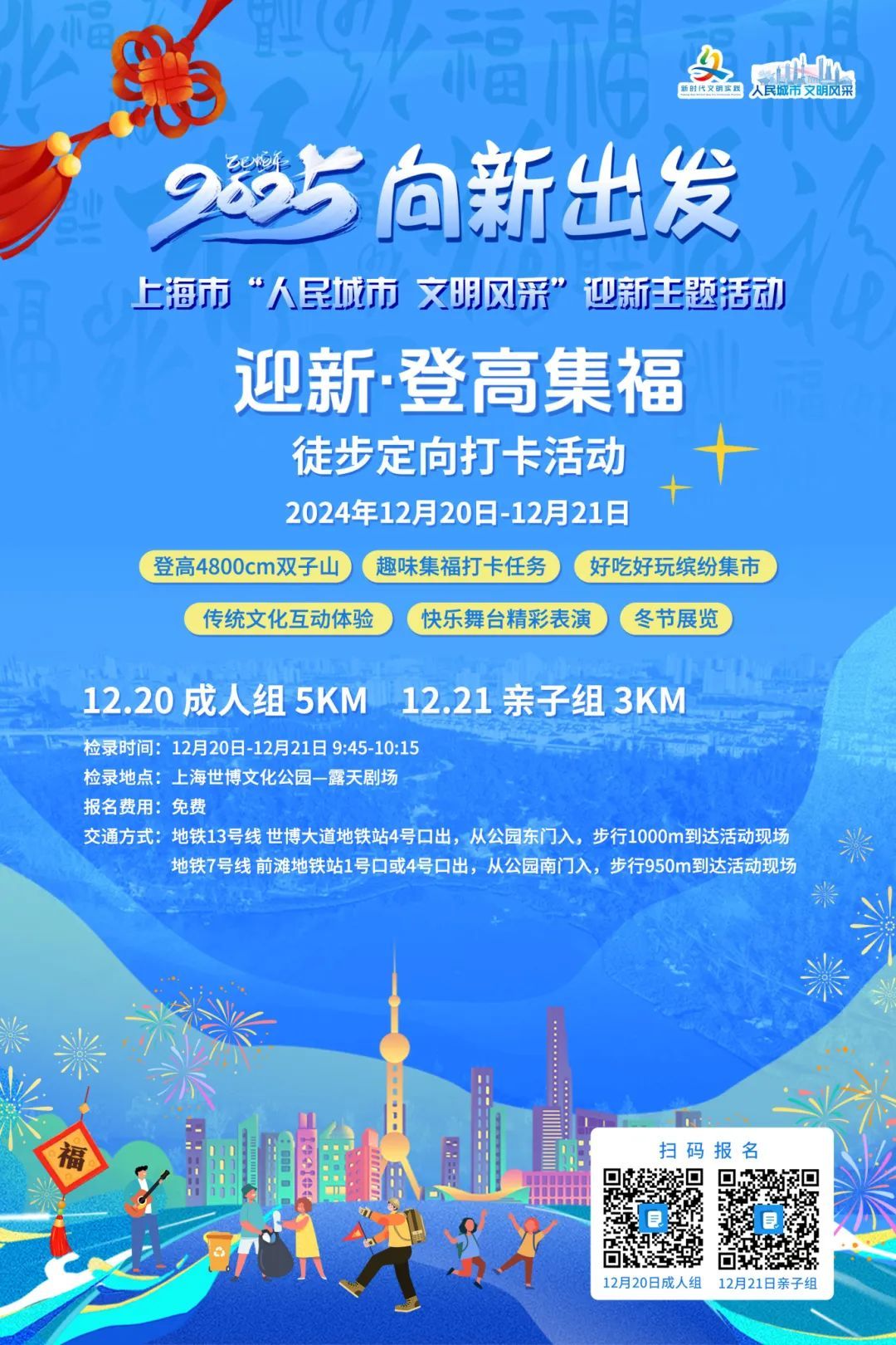 市精神文明办介绍,“2025向新出发”上海市“人民城市 文明风采”迎新主题活动将于12月20日至22日在上海世博文化公园举行,本次活动在公园内的露天剧场、双子山、温室花园等热门场所开展,包含“登高集福”“文明打卡”“文明集市”“快乐舞台”“冬节展览”“实践荟萃”六个版块,其中“登高集福”徒步定向打卡即日开始报名(免费),额满即止。详见↓