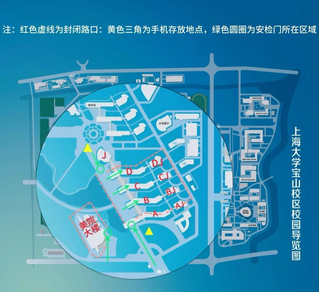 (一)上海大学考点的所有考场均安排在上海大学宝山校区,分布在上海大学宝山校区A、AJ、B、BJ、C、CJ、D、DJ教学楼、美术学院、音乐学院。