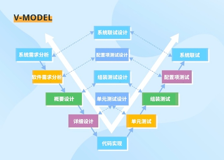 V模型纵向上划分了研制任务自顶向下的各个阶段,顶层需求分析、验收测试过程主要面向用户,越往底层技术工作越深入,从而构成了一个V型的模样。