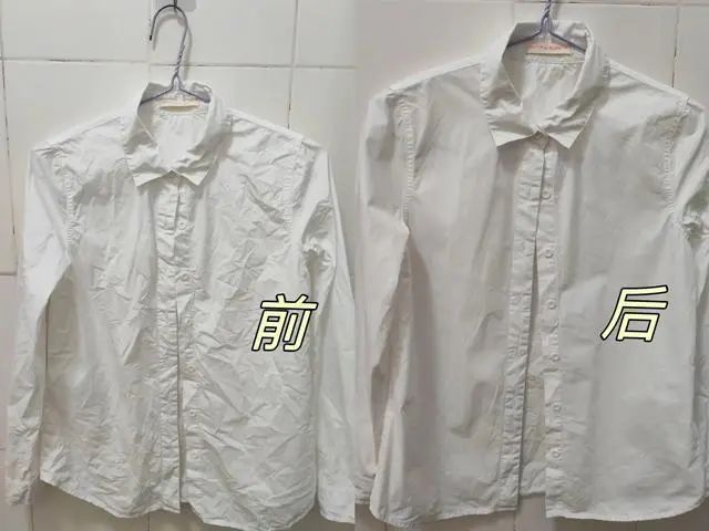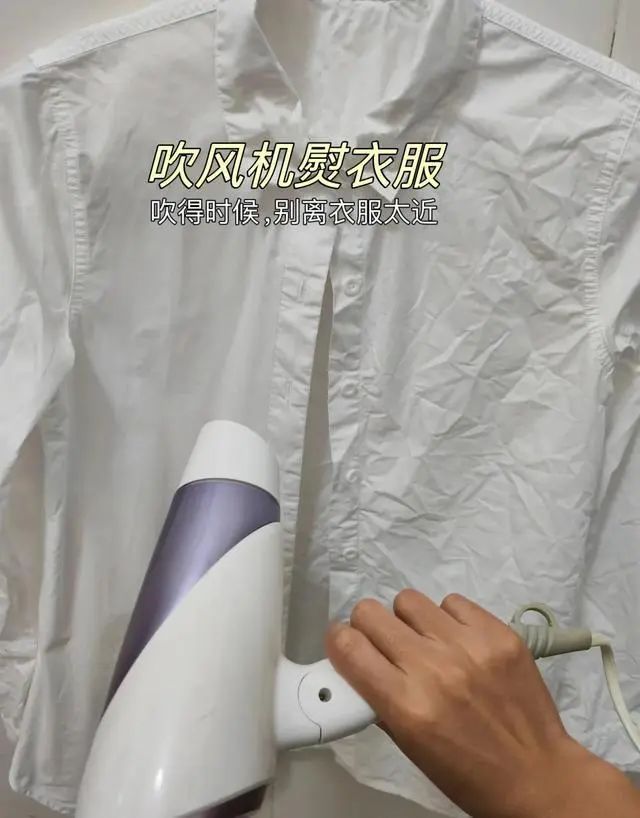 首先在衣服上喷点水,有点点润,然后热风会把大部分的褶皱吹平整!