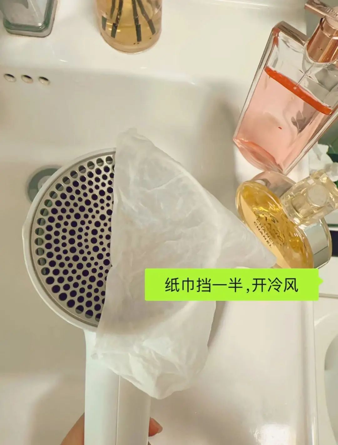 拿张纸巾打湿,喷上喜欢的香水,把纸巾置于吹风筒后面出风的一半位置。(务必留出一半出风口,不能全挡住)