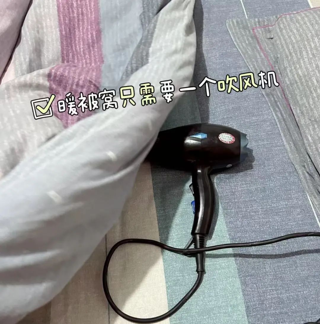 吹风机暖被法:把被子平整地铺在床上,手持吹风机,沿着被子边缘缓慢移动,吹的时候要看到被子鼓起来,这样确保中间部位能吹到。只要吹个2分钟,一会就能变暖和。