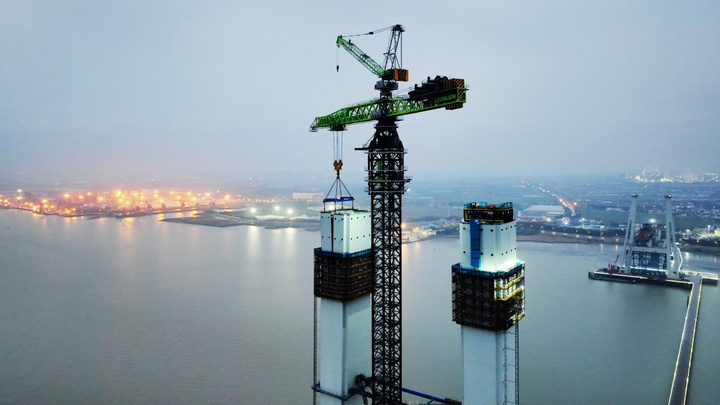 张靖皋长江大桥南航道桥:南主塔吊装进度过半