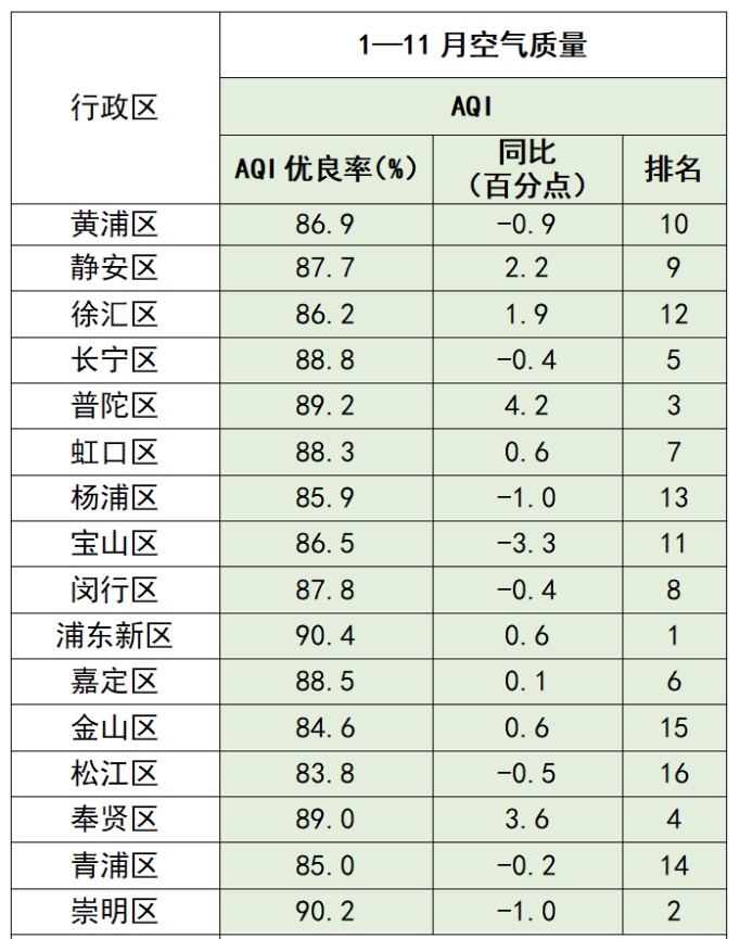 ■今年1-11月,各区AQI优良率由高到低排名,前3名为浦东新区、崇明区、普陀区,松江区、金山区、青浦区分列倒数第一至倒数第三。