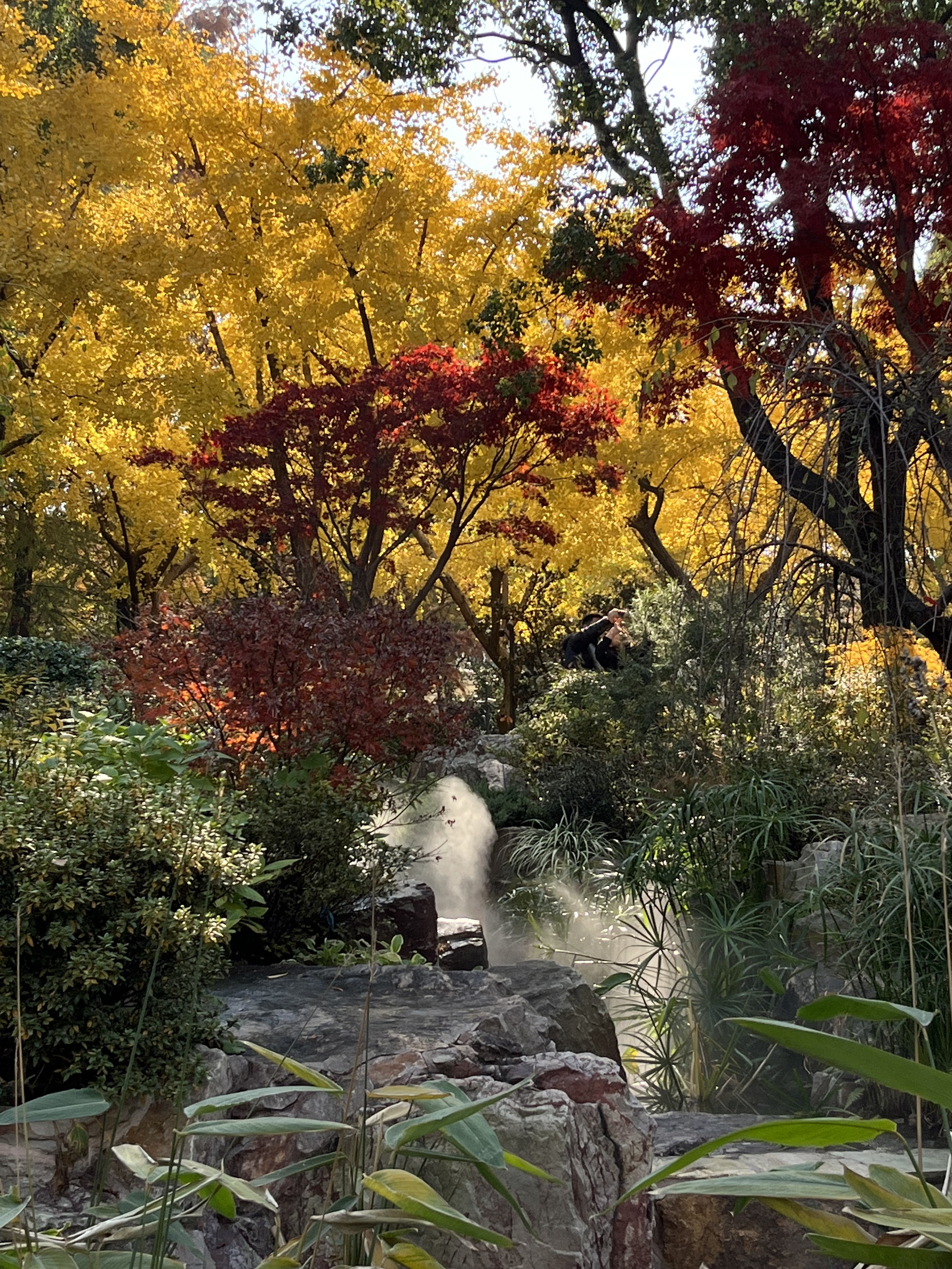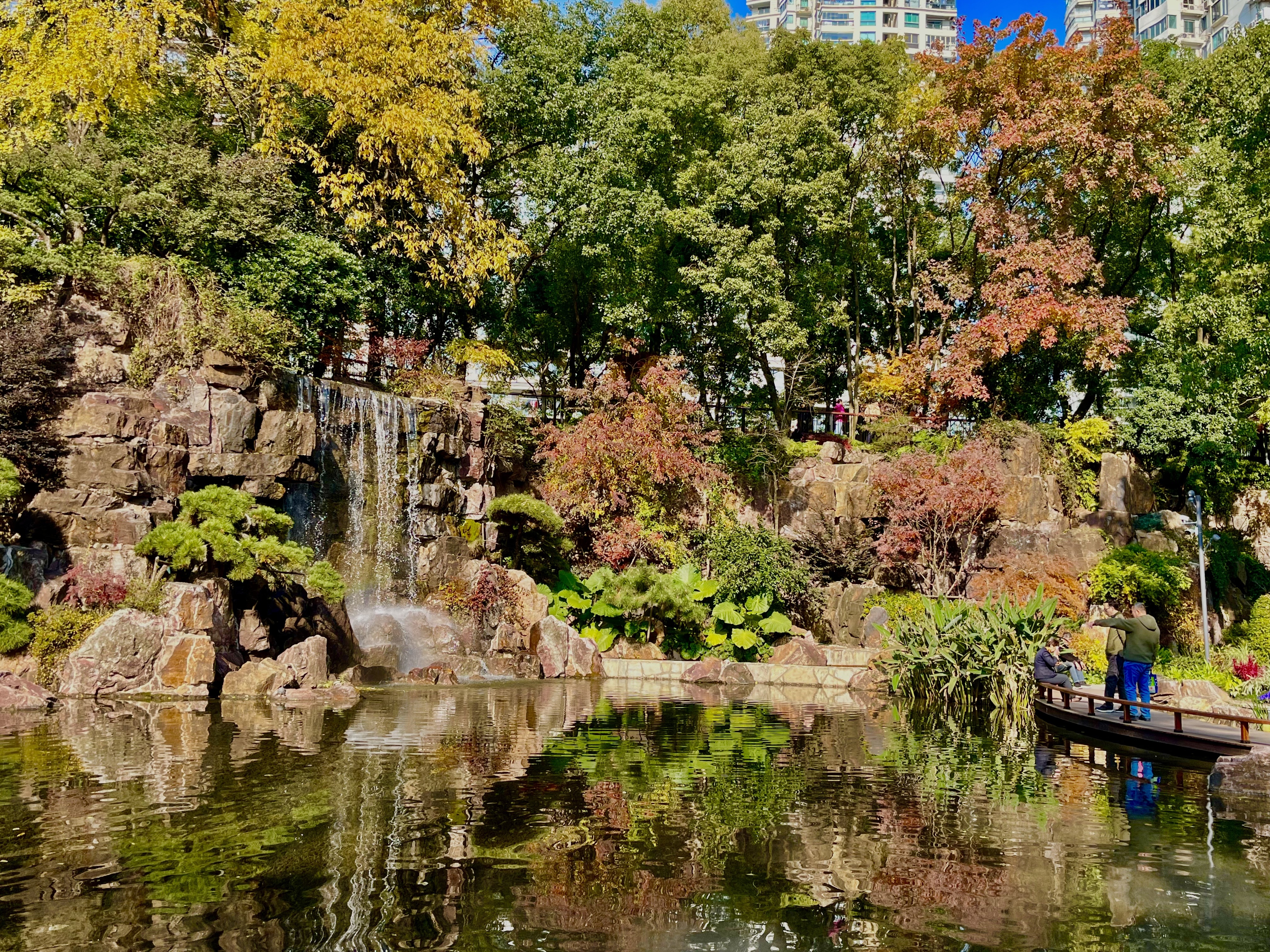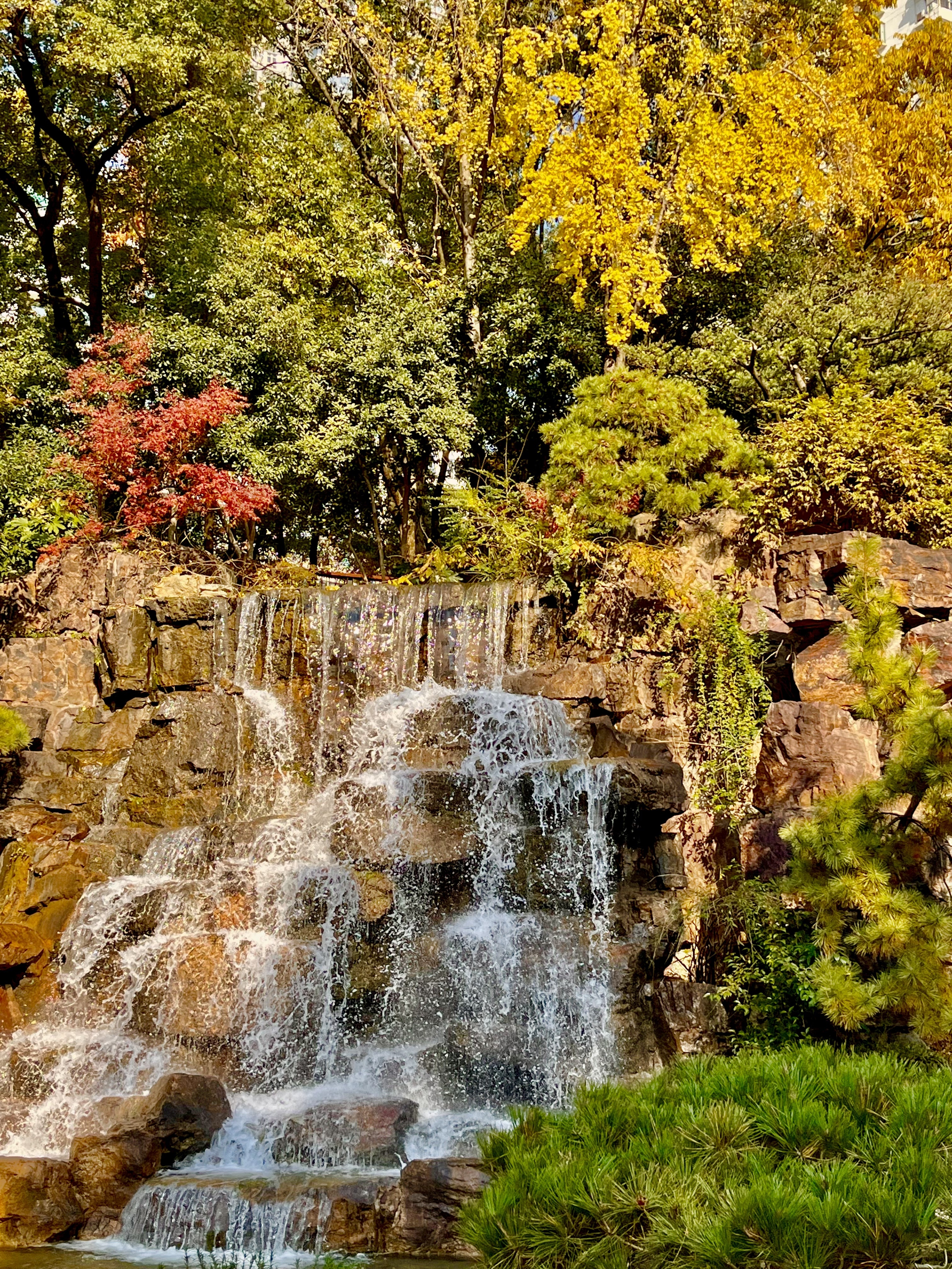 锦山清丽如画,绣湖岚烟升腾。假山叠瀑,是辅德里公园人气最高的打卡地。