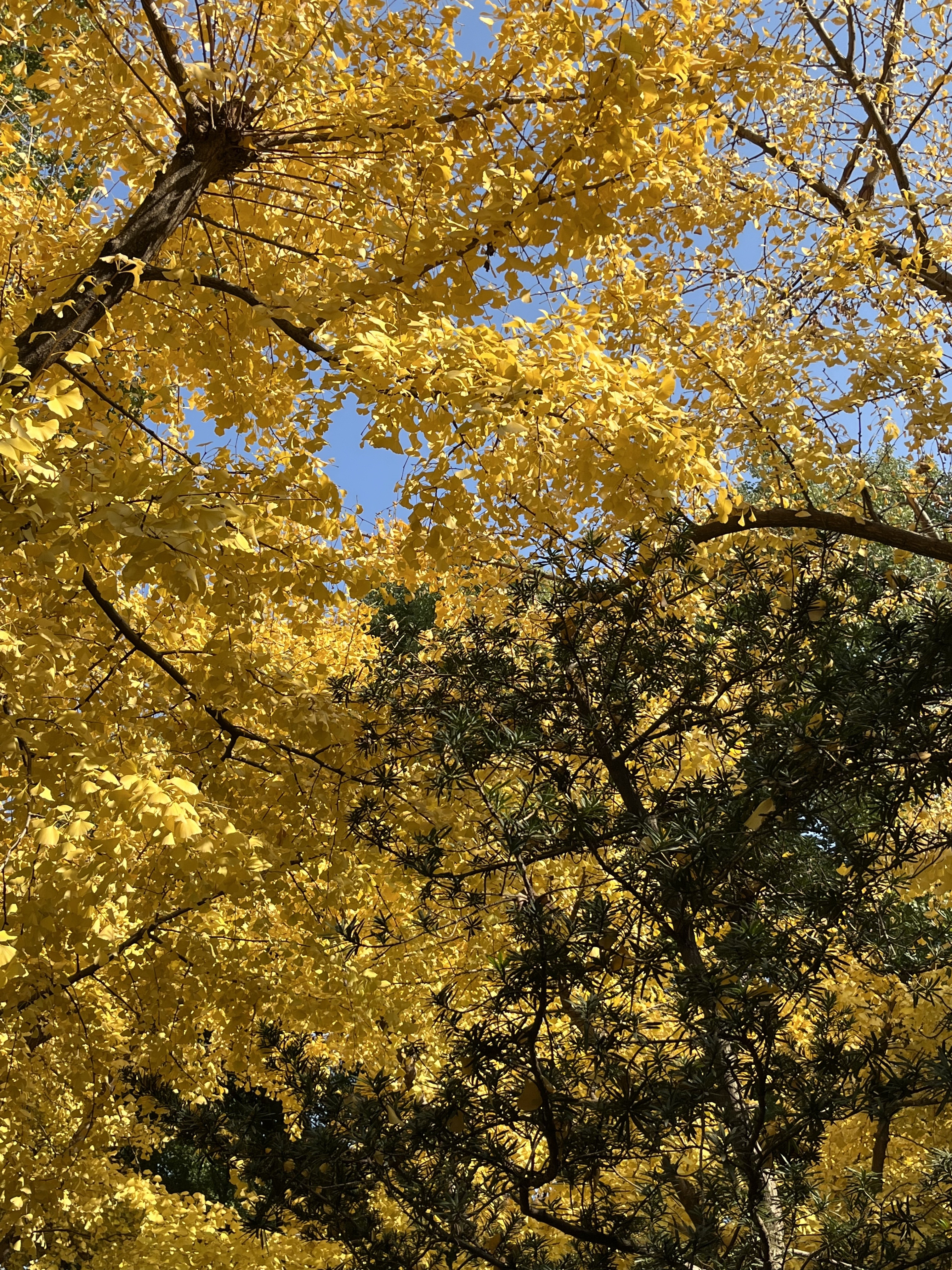 银杏挺拔矗立,一阵风吹过,落下一地金黄;