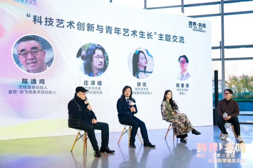 推介会邀请多位在专业领域深耕的艺术从业者,进行“科技艺术创新与青年艺术生长”主题交流。围绕科技艺术创新与青年艺术发展的关联性,探讨未来科技与艺术融合的新可能。金臣·亦飞鸣美术馆、杰铭画廊创始人、艺术家陈逸鸣从画廊主和艺术家角度,分享支持青年艺术家的心得与期望;艺术批评人、艺术科普作家庄泽曦围绕国内科技艺术的前沿动态展开分享;33楼美术馆主理人、艺术家徐优结合此次参展体验,详细介绍其作品中的科技与人文关怀。对于未来能够与张江科学会堂进行更多艺术内容的合作,共创共建科学城多元活力的科创生态,艺术家们也从不同视角表达了美好愿景。