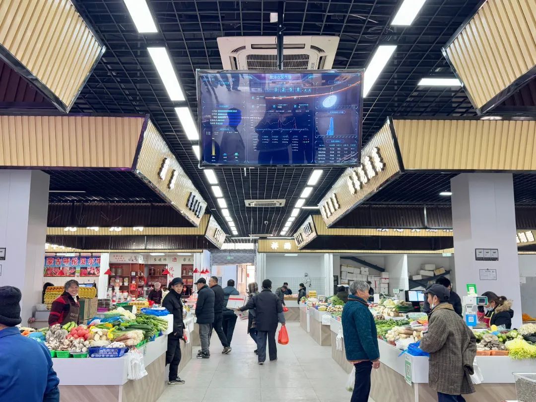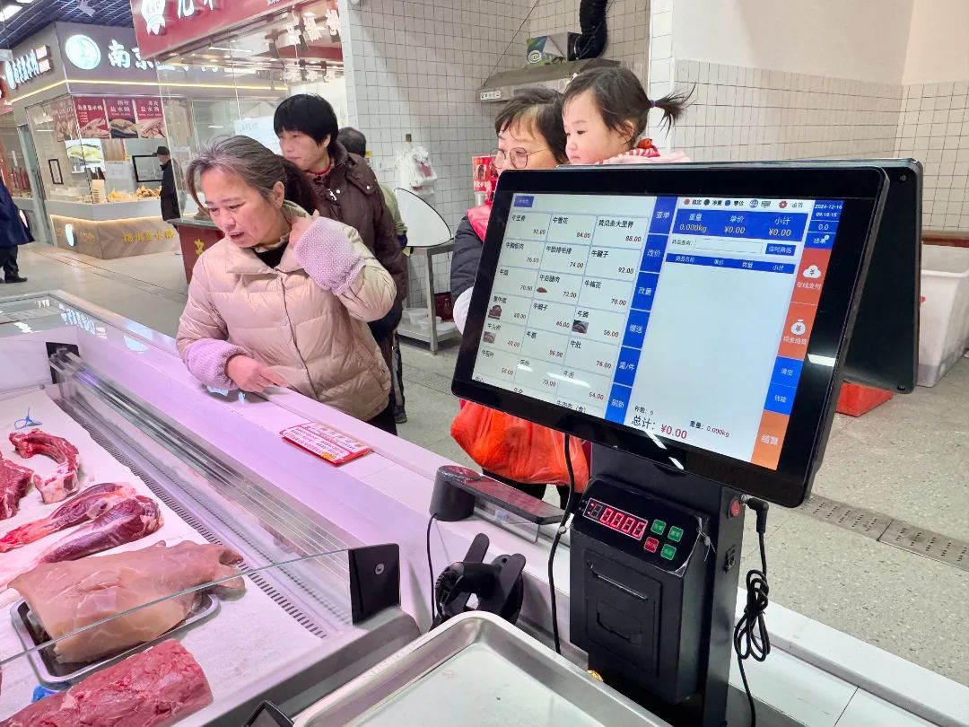 “菜篮子”买得舒心,更要“拎”得安心。在市场入口处,新设立的电子显示屏正滚动播放着商品单价、成交金额、销量排行等数据。各经营户摊位则统一换上了智慧识别秤,消费者只需将菜品放入秤盘,对应的价格、重量便会直接显示在公屏上。此外,当日市场的菜价、促销菜品、安全检测情况等各项信息也一目了然,通过联网,摊位的交易数据会直接录入后台智能化系统,再通过大数据统计情况分析反馈各类菜品需求程度,方便经营户准确掌握日常进货需求,后续也可实现市场可视化监管。