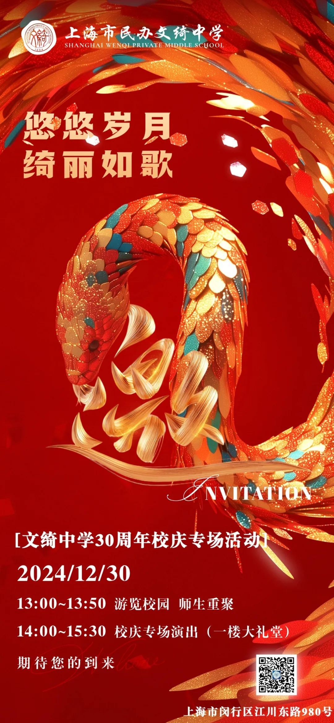 上海市民办文绮中学是由著名教育家、纺织实业家、近代色织工业先驱者诸文绮先生始创。1994年恢复建制成为一所民办全日制完全中学。学校位于上海南部科创“大零号湾”区域内,地理位置优越,与多所知名高中、大学以及高新技术产业开发区相邻,为师生提供了丰富的学术资源和交流机会。 12月30日,文绮中学迎来30周年校庆!本次校庆活动开放100个校友进校的名额,赶快动动你的手指预约起来~