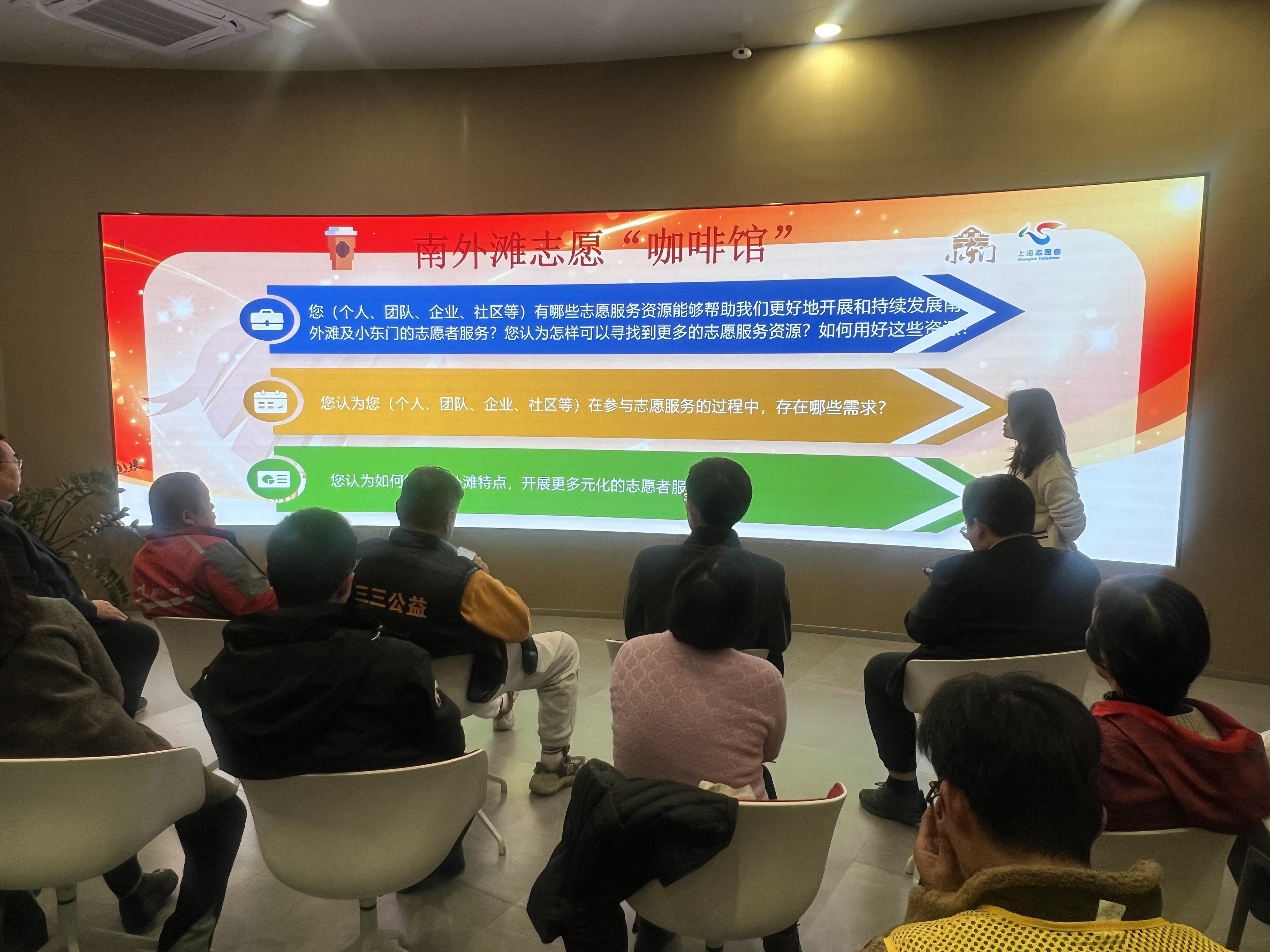 “您有哪些志愿服务资源,能够帮助‘南外滩Family’志愿者服务队更好地开展志愿者服务?您认为怎样可以寻找到更多的志愿服务资源?如何用好这些资源?”“您认为您在参与志愿服务的过程中,存在哪些需求?”“您认为如何结合南外滩特点,开展更多元化的志愿者服务?”
