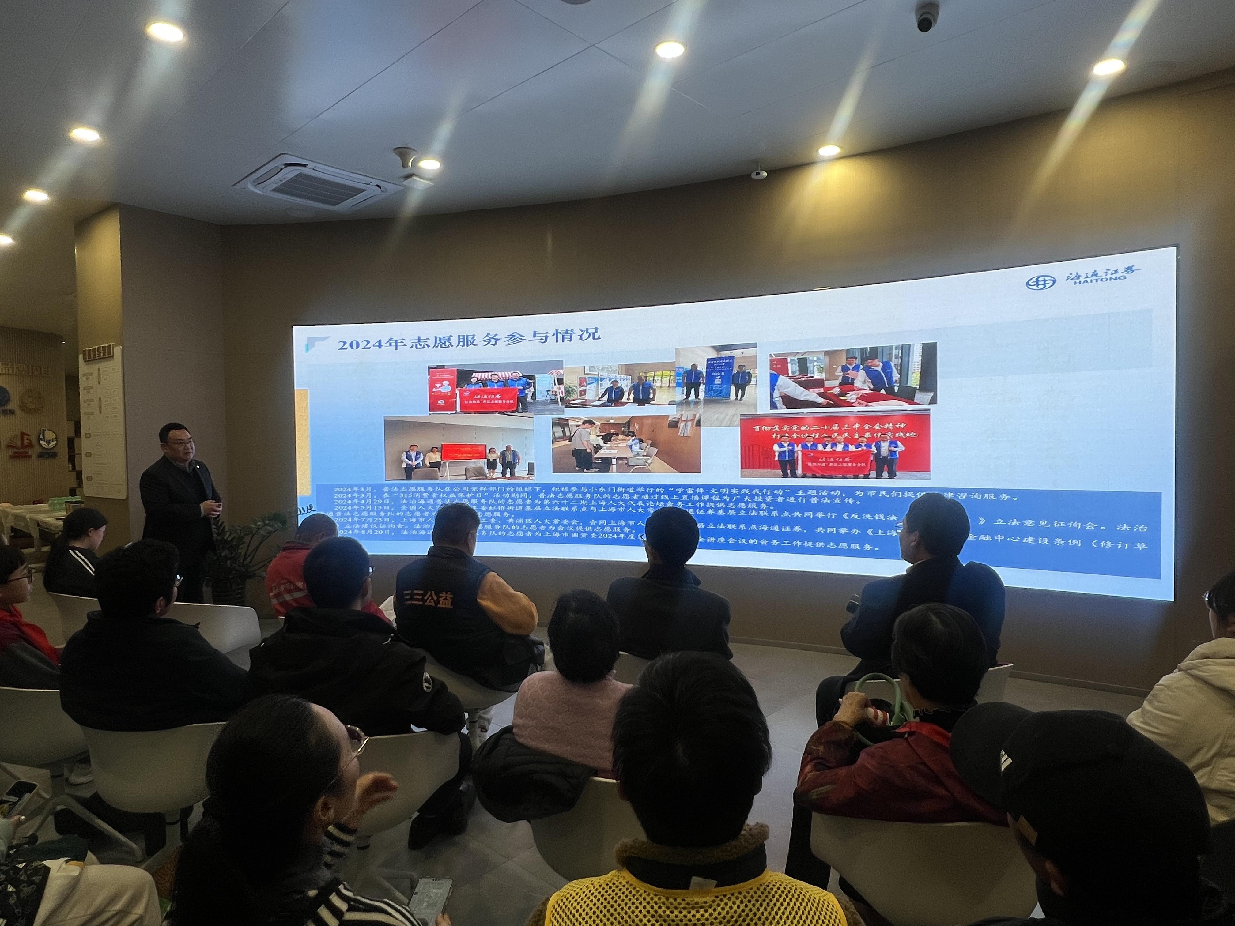 “法治海通”普法志愿服务队,作为海通证券股份有限公司“爱在海通”志愿服务总队的一支专业性金融法治人才分队,以普法教育、法治宣传、立法征询为主要服务内容,积极参与小东门街道开展的各项志愿者活动。尤其在“3·15消费者权益保护日”期间,“法治海通”的志愿者们都会通过线上直播课程等形式,为广大投资者和市民进行普法宣传,受到了广泛好评。