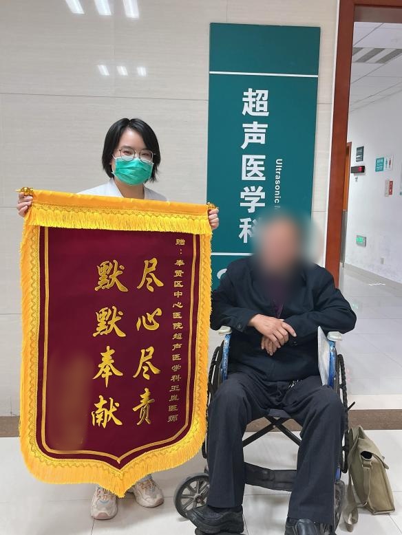 一个平常的工作日,一位坐在轮椅上的老先生在家属的陪同下,坚持带着锦旗来到奉贤区中心医院超声医学科,向王岚主治医师表达谢意。老先生紧握着王岚的手,激动地表示:“王医生,非常感谢你。因为你的细致检查让我及时发现了肿瘤,幸运地保住了我的肾脏。”