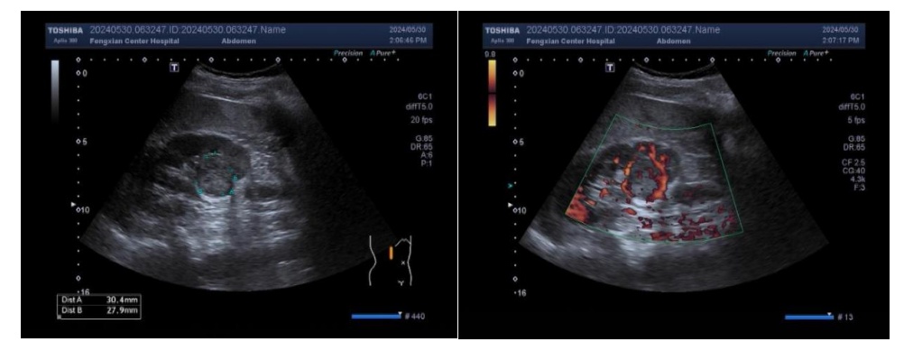 事情还要回溯至半年前。这位老先生姓钱,今年61岁。5月30日,钱先生因右下腹疼痛到区中心医院泌尿外科就诊。超声检查中,王岚发现钱先生的右肾有轻微积水,并在输尿管上端找到了引起尿路梗阻的结石。尽管引起钱先生腹痛的“真凶”已经找到,可“较真”的王岚仍对肾脏仔仔细细地扫查了一遍,意外地在右肾中下部发现了一个与正常肾脏组织极其相似的“可疑”团块。经过反复扫查比对,王岚确信这里藏着一个肿瘤,而且恶性的概率很大!