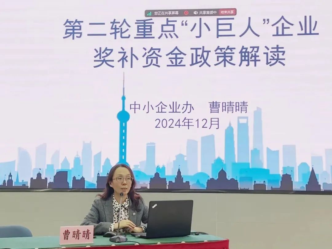 目前,上海已培育国家级专精特新“小巨人”企业857家,174家企业获得国家高质量奖补资金支持。为进一步争取国家支持,本次活动聚焦专精特新“小巨人”企业开展高质量政策培训,从政策导向、申报要点、支持方式等方面进行详细解读,支持本市专精特新“小巨人”企业紧跟国家发展战略,快速做大做强。
