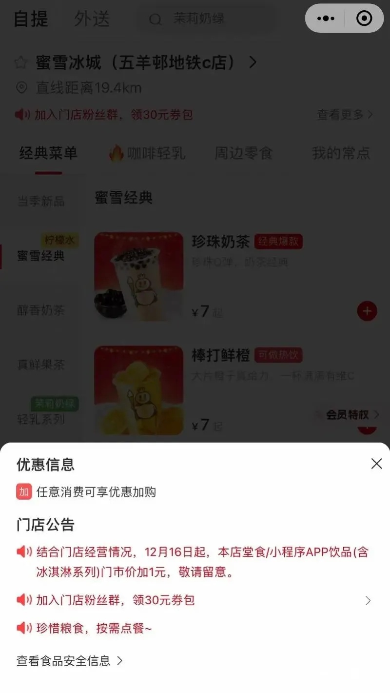 12月16日,广州多家蜜雪冰城门店在小程序上发布公告称,“综合门店经营情况,12月16日起,本店堂食/小程序APP饮品(含冰淇淋系列)门市价加1元”。