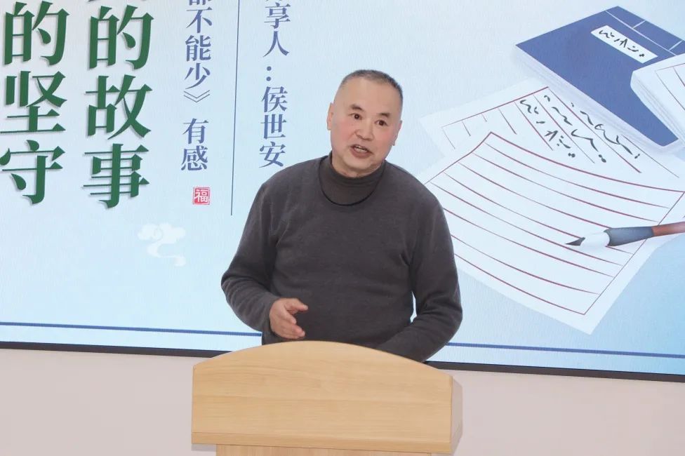 施祥生老师先是从报告文学与文学作品的区别讲起,描述了他在新疆阿克苏党校当老师时发生的趣事,再延伸去讲中国的志气。“《天上有个太阳》在新疆完成。当时正值新疆十大优秀县委书记选举,走访很多旁人从未接触的县。有一天车子在路上抛锚,正在半山腰上,太阳即将下山,站在路上往下看,山下有个红点点,我问书记那是什么,书记回答说是红旗,只要有红旗的地方就有学校。第二天我就去拜访了学校,一起观看了升旗仪式。当时就有一个这样的学生迈着奇怪的步伐升旗,和张艺谋交流拍电影的时候就按照这样改,哪怕你做错了,但是也能从中获得感动。”