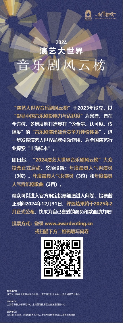 “2024演艺大世界音乐剧风云榜”评选结果将在2025年2月举办的演艺大世界“新年有戏”主题活动上正式揭晓。