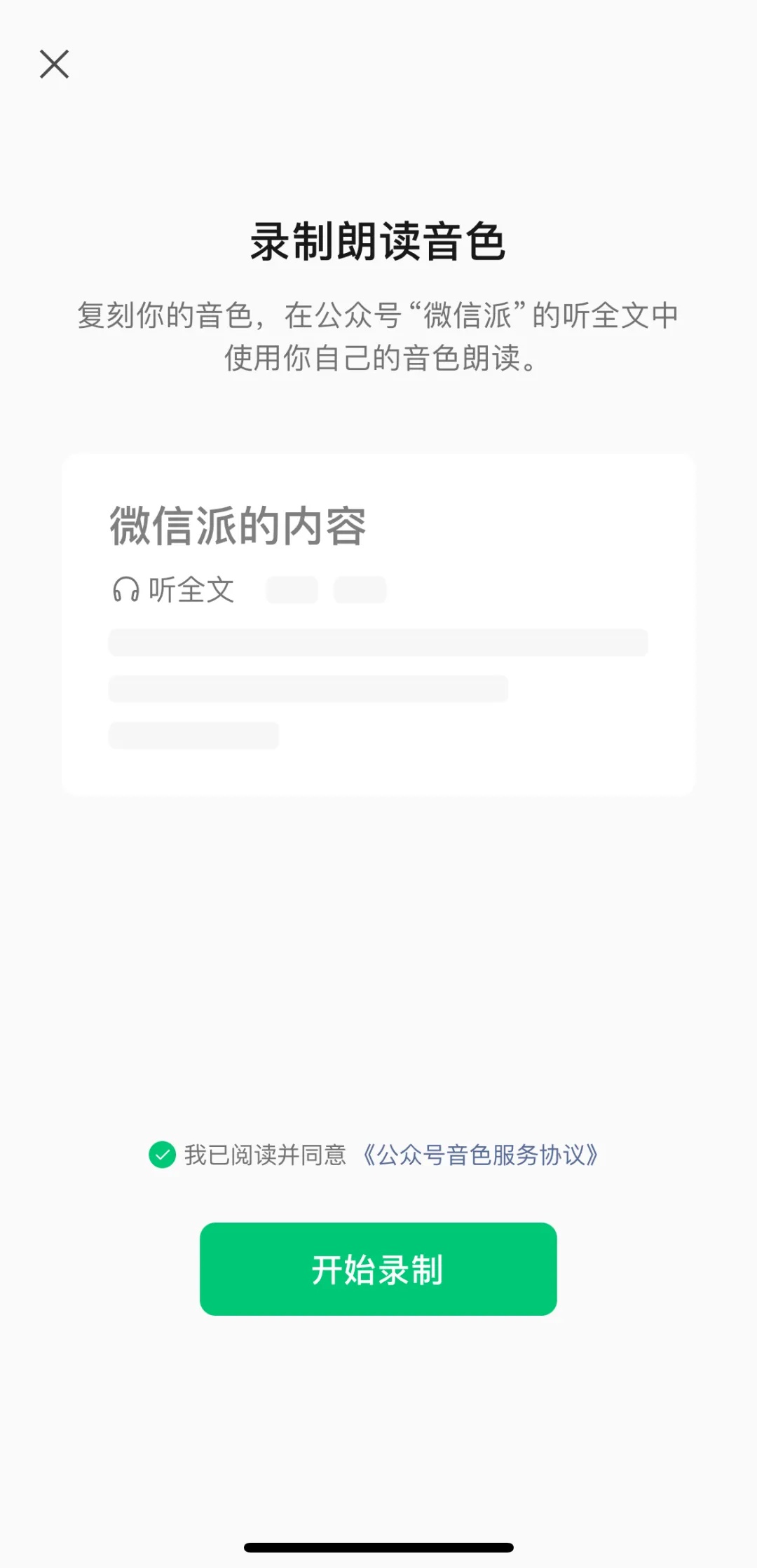 “发声”第一步,作者需要下载一个“订阅号助手”APP,点击“我—设置—朗读音色”,就可以录制例句,例句也会复刻你的语气和情感。录制完成并点击应用,即可在公众号里拥有自己的个性化语音。 (左右滑动查看详情) 左右滑动查看 据悉,该能力还在灰度中,尚未被灰度到的创作者还需等候。
