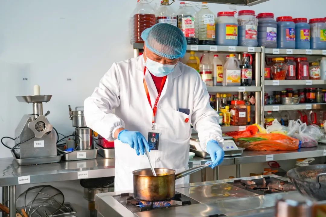 走进中国蘸酱上海研发中心冷加工研发室,开阔的研发室内摆满了各类调味品,研发人员身着白色实验服,在实验台上忙碌着配比各式酱料。而在另一边的热加工研发室,研发师正在炒制新开发的蘸酱样品。