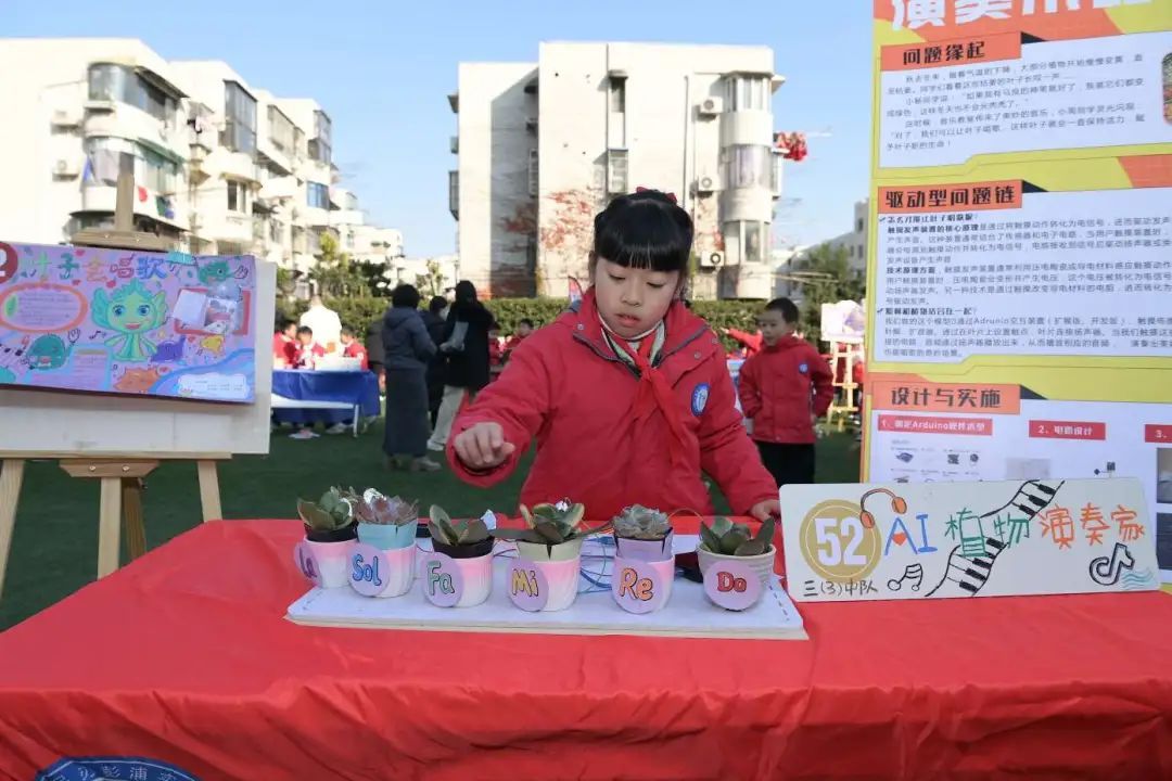 特别是学生团队自主研发的“AI植物演奏家”项目,更是将科技创新与艺术教育完美融合,展现了孩子们的无限潜力与创造力,成为了此次嘉年华的一大亮点。“秋去冬来,校园植物的叶子开始慢慢变黄,直到枯萎……我们能不能让叶子唱歌?这样叶子就会一直保持活力!”三(3)中队的同学们用交互装置、触摸传感器、MP3模块和扩音器等制作了AI植物演奏乐器,通过在叶片上设置触点,展现出植物也能唱歌的奇妙场景。