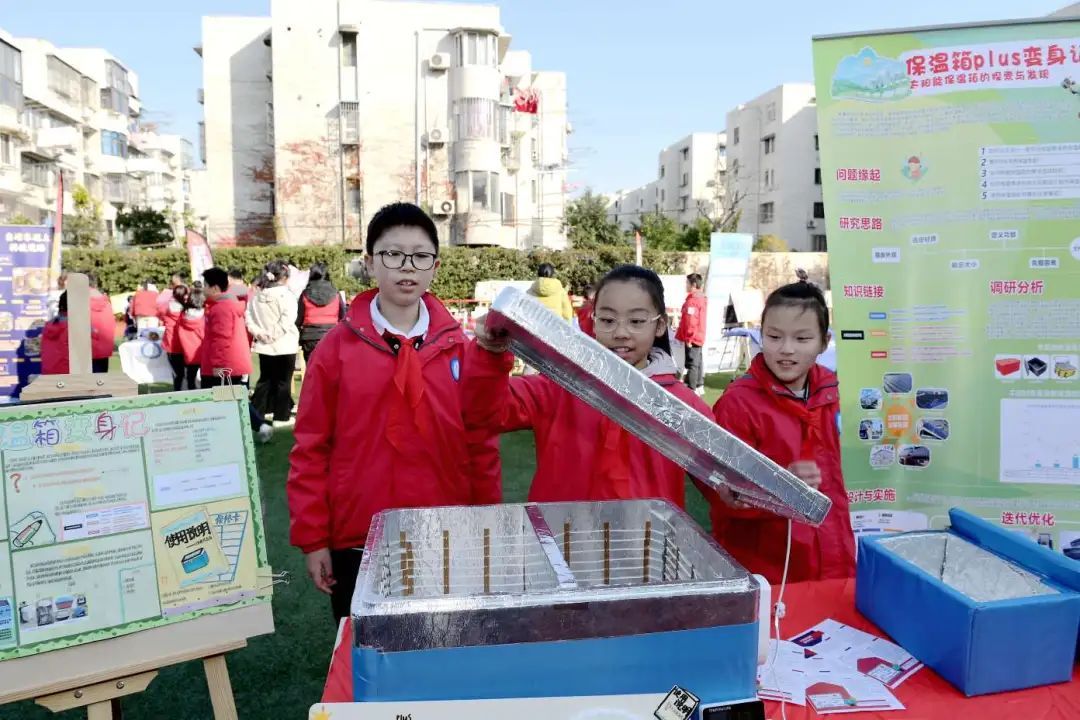五(5)中队的胡冬辰介绍了团队与语文导师共同制作的太阳能保温箱,“现在已经是冬天了,考虑到学校中午的饭菜放在箱内可能会凉掉,于是我们就一起利用科学知识,制作了这款太阳能保温箱,可以将太阳能转化为电能,为保温箱持续供电,让午饭一直保持热乎乎的状态。”