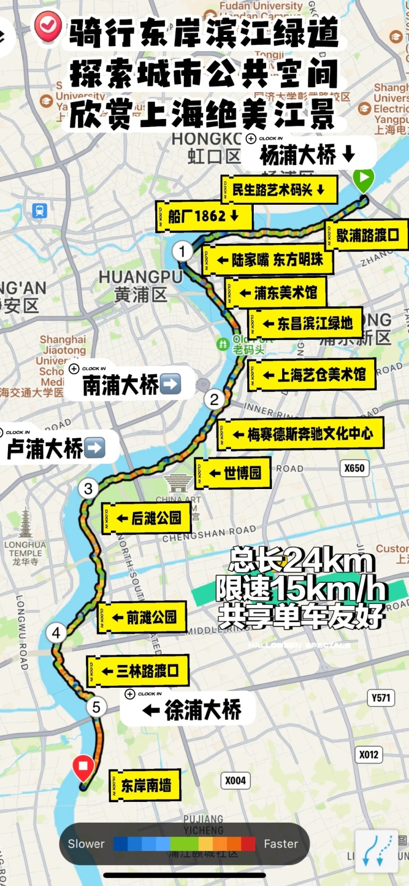 Citywalk路线:14号线歇浦路地铁站,起点:杨浦大桥北墙(歇浦路渡口)-民生路艺术码头-船厂1862-陆家嘴东方明珠-浦东美术馆-东昌滨江绿地-上海艺仓美术馆-南浦大桥-梅赛德斯奔驰文化中心-世博园-卢浦大桥-后滩公园-前滩公园-三林路渡口-徐浦大桥-终点:东岸南墙。