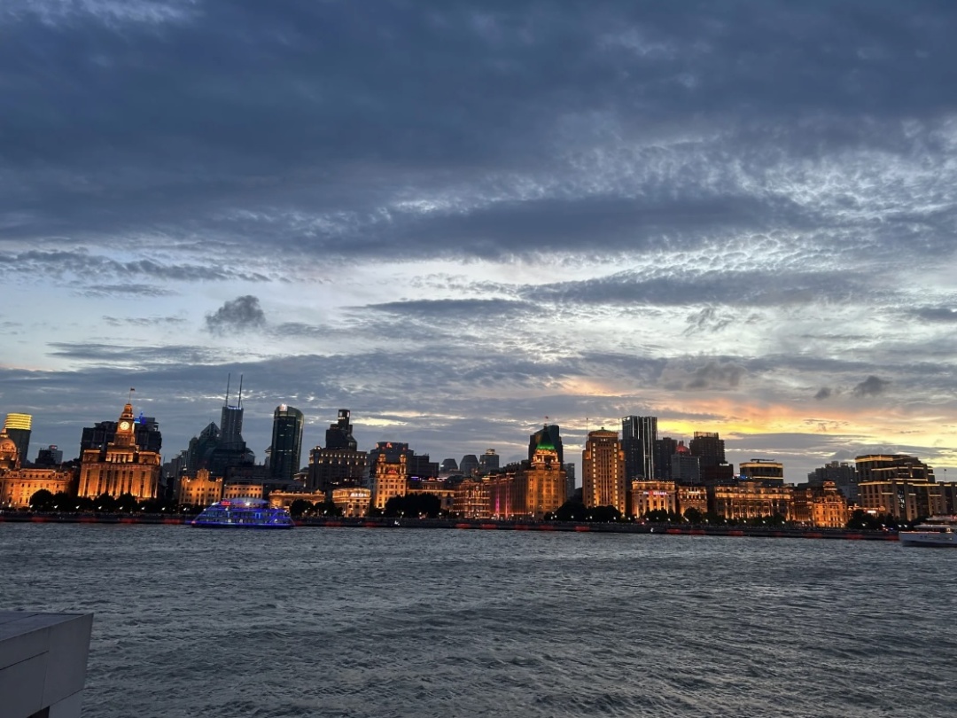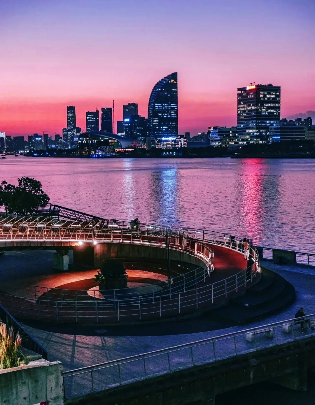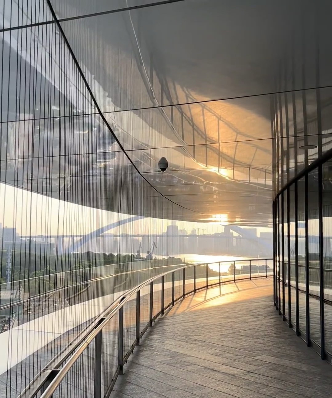 行走在旋转的楼梯步道之上,看江面缓慢行驶的轮渡,远处的霓虹渐渐亮起,天色慢慢黯淡,浪漫得仿佛闯入魔都版爱乐之城。