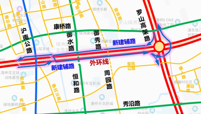 S20(沪南公路-罗山路)新建地面辅路工程位于浦东新区,西起沪南公路,东至罗山路立交,全长约2.6km。工程主要是在S20主线南、北两侧新建地面辅路、增设掉头车道,辅路采用单向2车道规模,设计时速50公里。新建辅路限高为5米,掉头车道限高为2.3米。