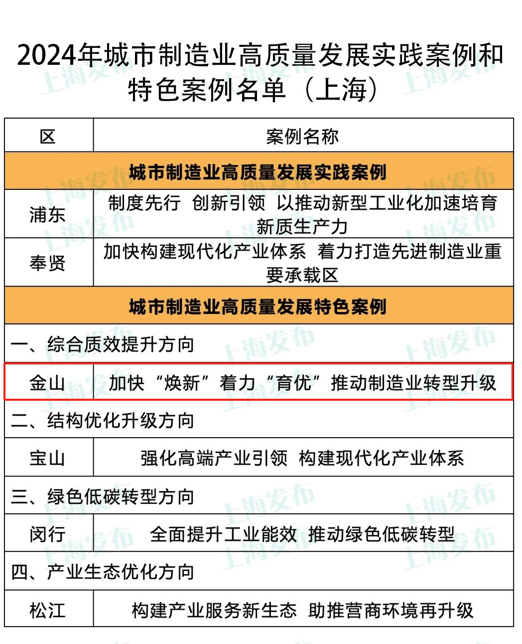 近日,2024年城市制造业高质量发展实践案例和特色案例名单公布,全国共评选20个实践案例和70个特色案例,上海共有6个典型案例入选,获评数量居全国前列,其中金山入选1例,详见↓