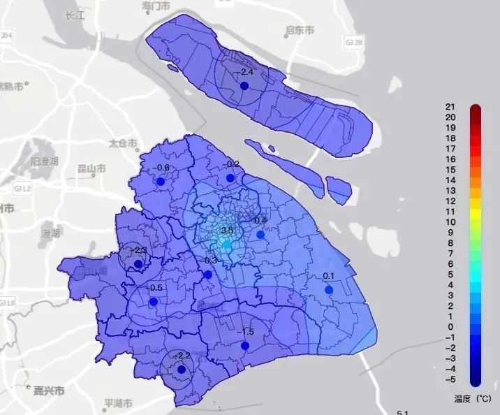 但由于云层减少,早晨辐射降温明显,市区徐家汇站最低气温3.5℃,大部分郊区最低气温在零下2.4℃到0℃之间,体感冰冷。