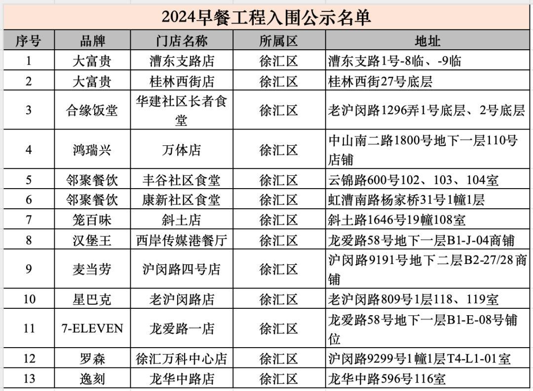 根据最新公布的《市商务委关于公布2024年上海市为民办实事项目早餐工程示范点名单的通知》,全市确定110个早餐网点为2024年上海市早餐工程示范点,徐汇区有13个网点名列其中,超额完成全年目标。