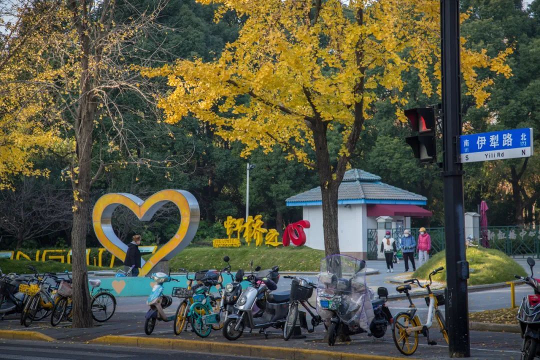 延虹绿地有一片小银杏林,落叶金黄,铺满地面,现在还是打卡的好时节。