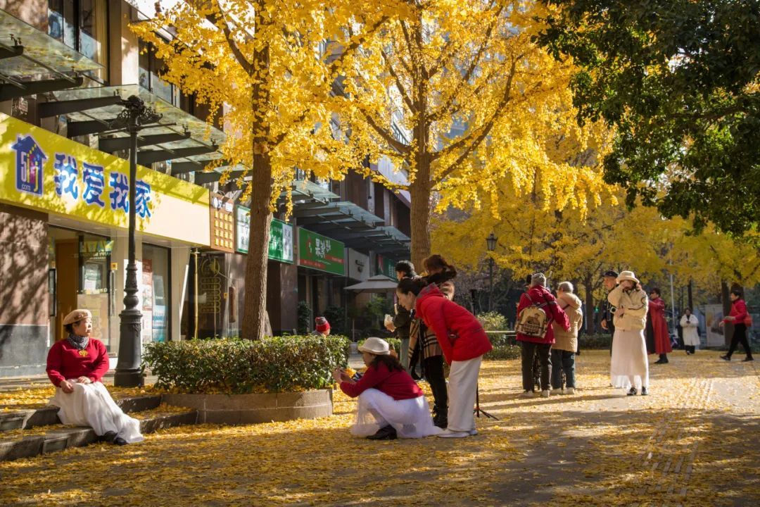 现在的黄金城道满眼都是金黄色,铺在路面上的银杏叶像一条厚厚的金色地毯,把黄金城道装扮得更有氛围感了。