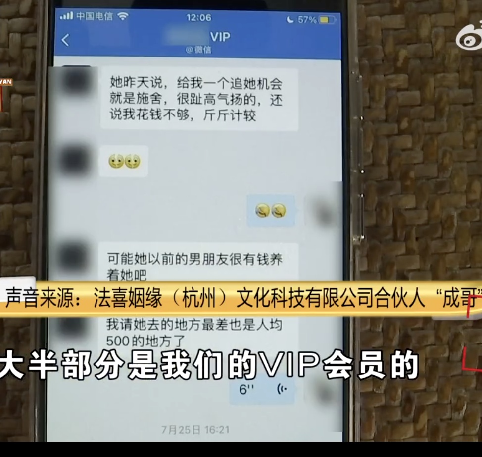 婚介机构表示,万女士的要求是比较高的,这种水平的男性在筛选上很有难度,需要一定成本,需要去查银行卡和学历。而且负责人表示,介绍的人有大半部分是VIP会员,但如果想要成功,就不能局限在会员中来找,其余还要在高净值人群去找,需要主动“猎寻”。