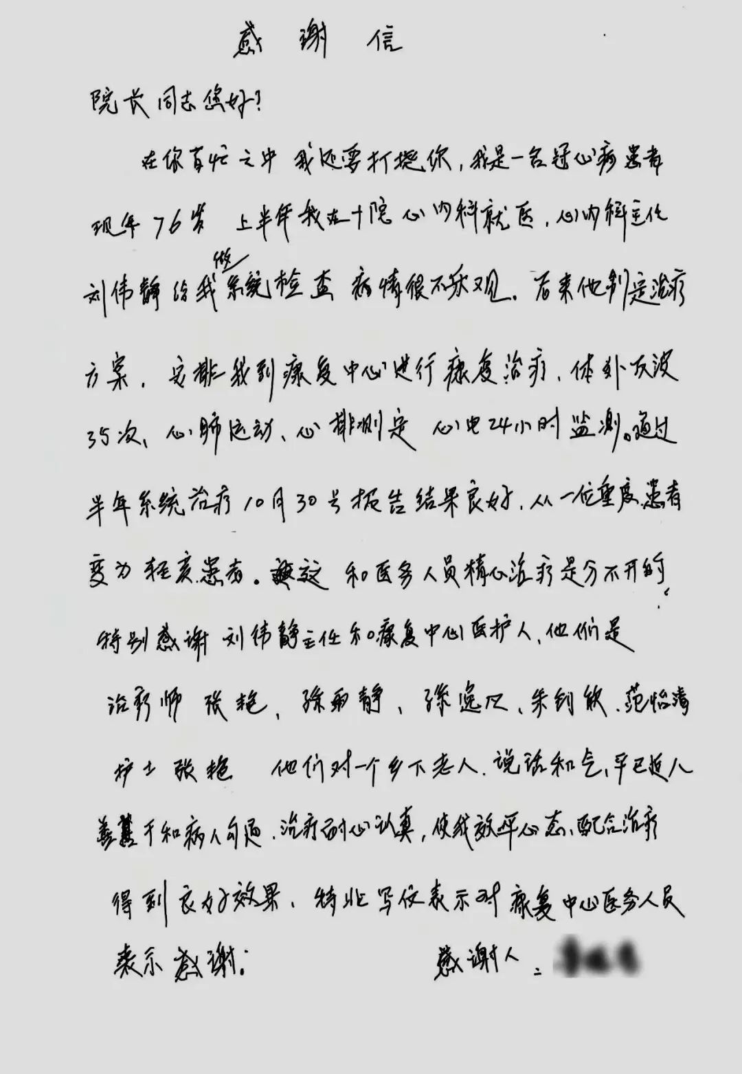 字迹不甚工整、间或有涂改之处,甚至还有错别字……然而,就是这样一封略显潦草的感谢信,却饱含一位古稀老人对上海市第十人民医院心血管内科—心脏康复中心刘伟静主任团队的深情。