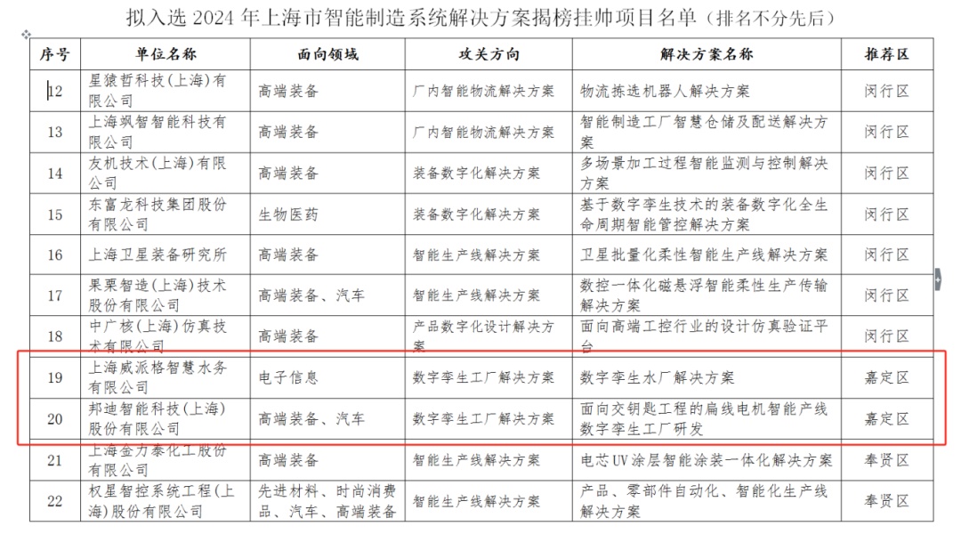 近日,位于外冈镇的上海威派格智慧水务股份有限公司和位于南翔镇的邦迪智能科技(上海)股份有限公司,分别凭借“数字孪生水厂解决方案”和“面向交钥匙工程的扁线电机智能产线数字孪生工厂研发”,成功入选2024年上海市智能制造系统解决方案揭榜挂帅项目名单。