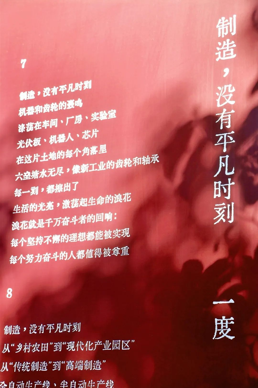正如此次展览中的长篇诗歌《制造,没有平凡时刻》中写道:“每一朵过江的云彩,都随着浪花奔涌”,这是我们所处的时代,“听,翅片发出叮咚叮咚的声音/清脆悦耳,像一曲曲欢乐的歌声”,这是我们见证的当下。在莘庄工业区,“每个坚持不懈的理想都能被实现,每个努力奋斗的人都值得被尊重”。
