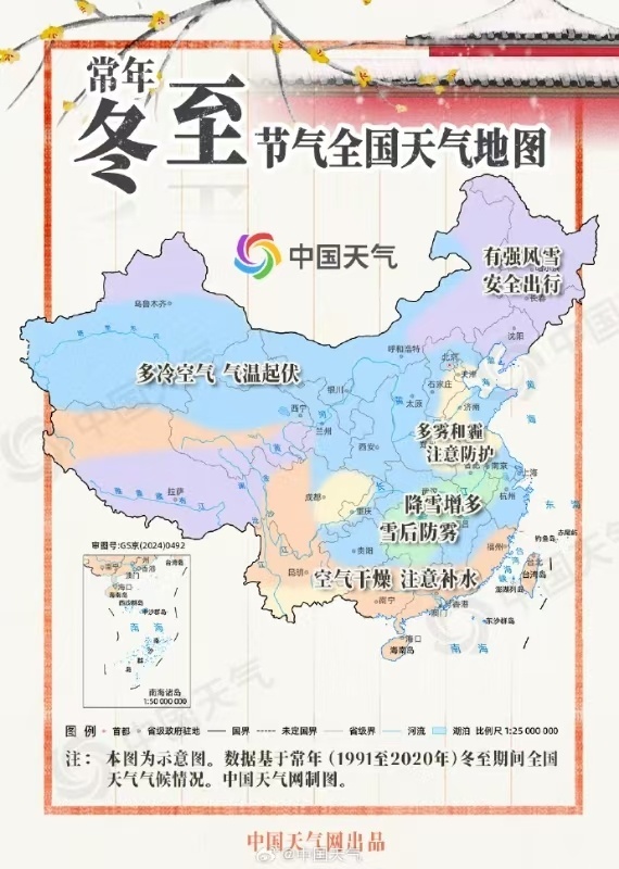 从中国天气网推出的常年冬至节气全国天气地图可以看出,冬至期间,我国北方冷空气活动十分频繁,大风一吹,冷得刺骨,尤其是黑龙江、吉林、辽宁和新疆北部、青藏高原一带可能出现强风雪,大家出行要做好防冻保暖措施,遇到暴风雪时尽量待在室内。